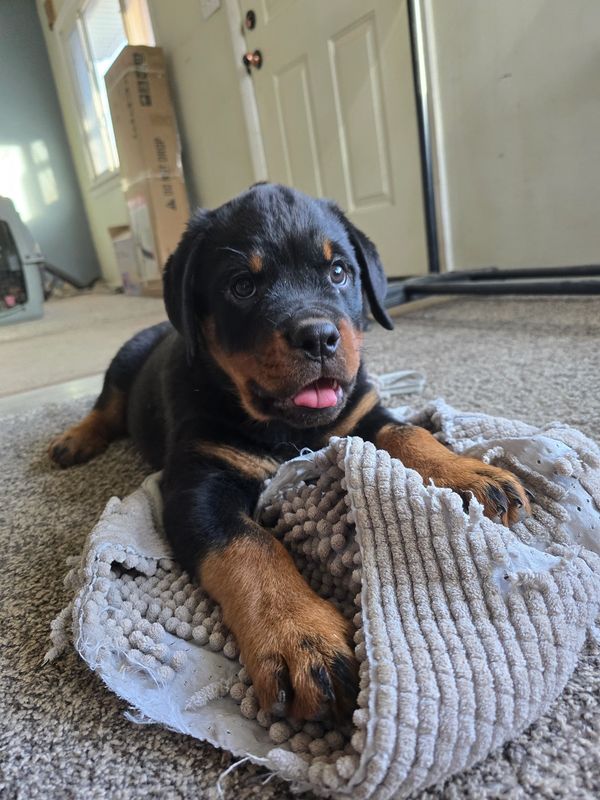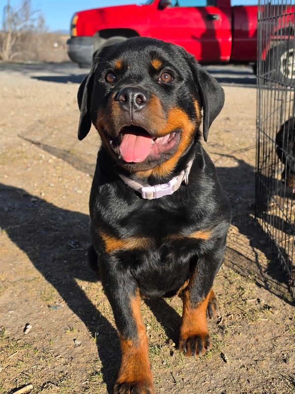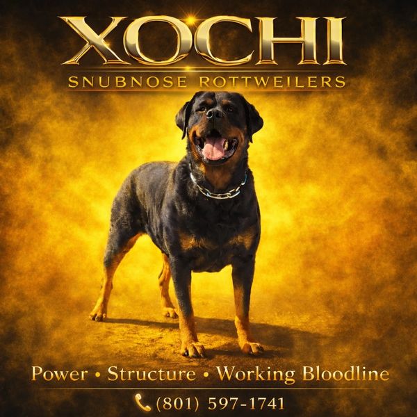 SnubNose Rottweilers Xochi was produced here. She's the daughter of Bär x Rom. She is hipp/elbow certified, and a big atheltic female that produces big, dark, and high drive German Rottweiler puppies.